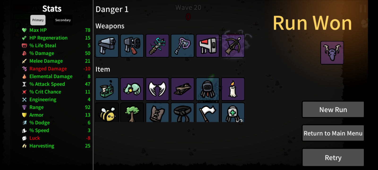 Prepare yourself for an impressive selection of weapons and items to discover. "Brotato" offers hundreds of choices, ranging from flamethrowers and SMGs to rocket launchers and even good ol' sticks and stones. Each weapon brings its own distinct playstyle, allowing you to unleash devastating attacks on your alien adversaries. Create powerful weapon combinations and master the art of destruction as you pave your way to victory!